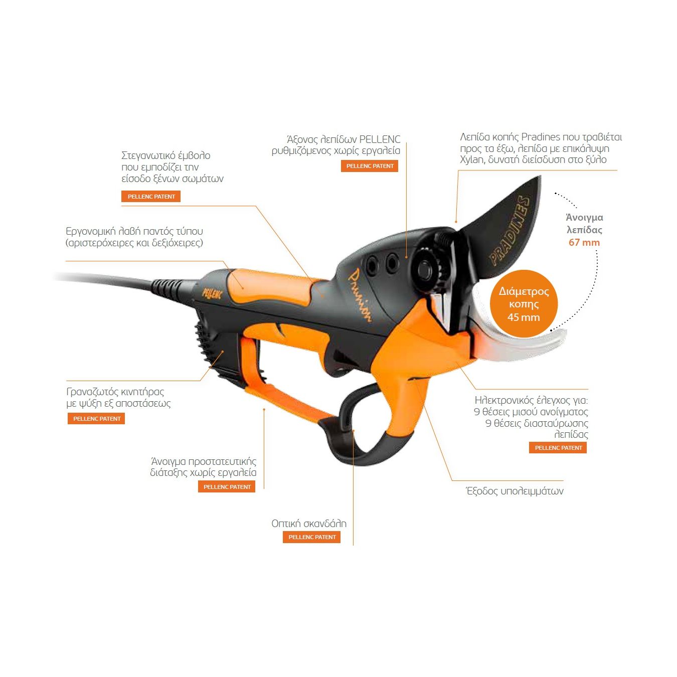 Οι πολλές καινοτομίες αυτών των ψαλιδιών κλαδέματος τα καθιστούν απαραίτητα σε όλους τους καλλιεργητές που αναζητούν ελευθερία στις κινήσεις τους με την μπαταρία 150 ή για εναλλάξ εργασίες με την μπαταρία 250 που σας επιτρέπει να συνδέσετε δύο PELLENC εργαλεία ταυτόχρονα π.χ. Prunion ψαλίδι & Μ12 πριόνι.